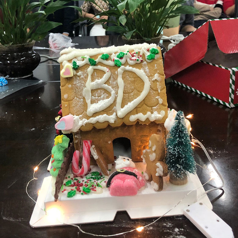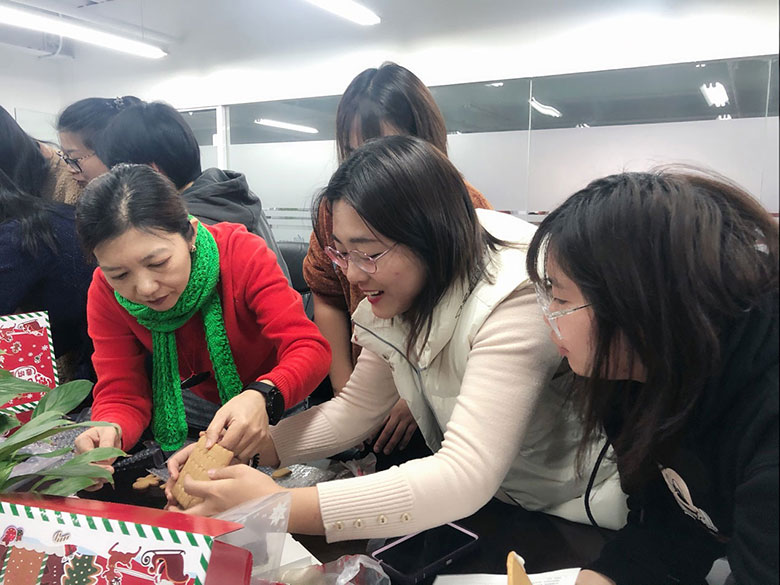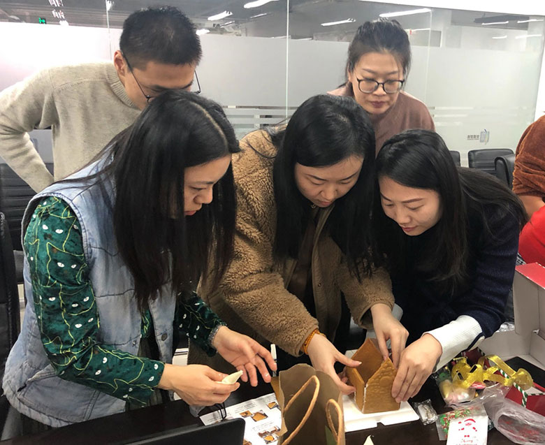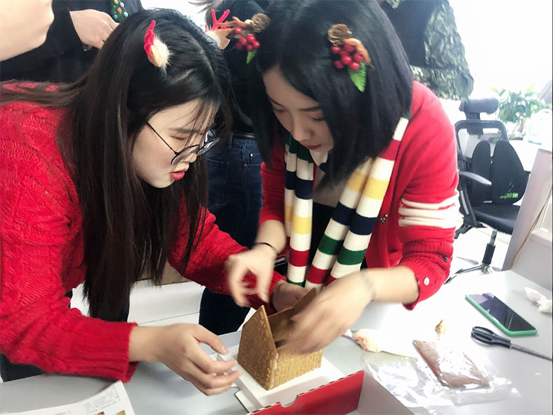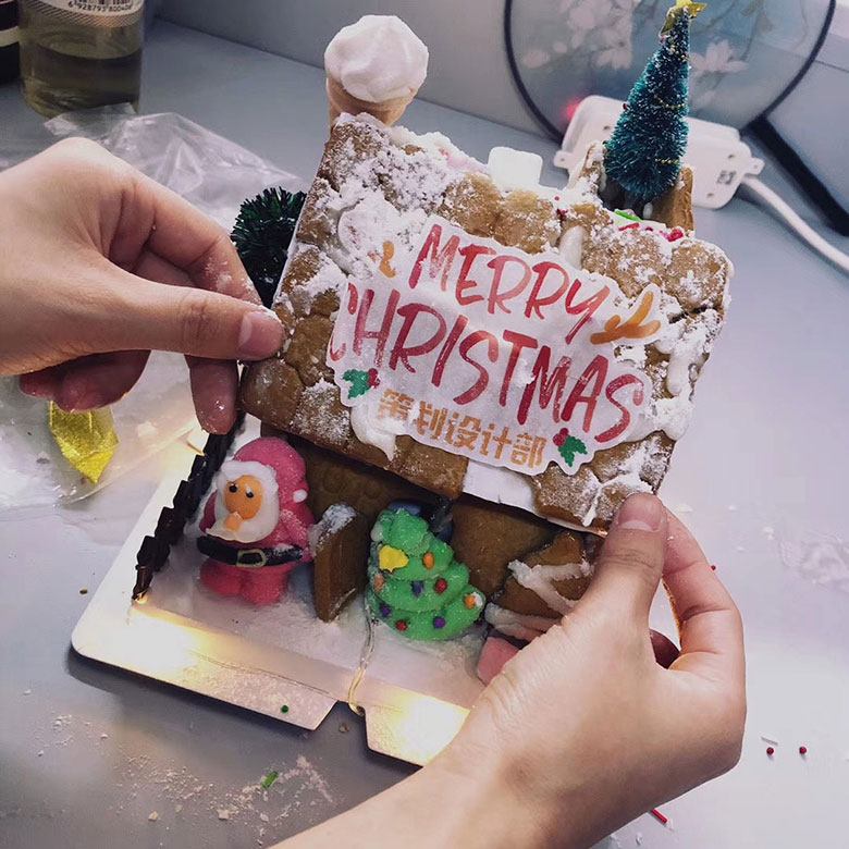 為了加強(qiáng)部門間聯(lián)動(dòng),策劃部和人力行政部伙伴特別設(shè)計(jì)了搭建姜餅屋大比拼活動(dòng),活動(dòng)超級(jí)有趣,小伙伴們分組,自己動(dòng)手,把美味的餅干用糖霜粘起,配上各種糖果和小彩燈,搭建出美輪美奐的小小姜餅屋,共慶美好的節(jié)日。
